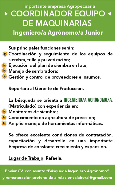 Buscamos Ingeniero/a Agrónomo matriculado para trabajar como Controlador de cosecha en la zona de San Francisco, Córdoba